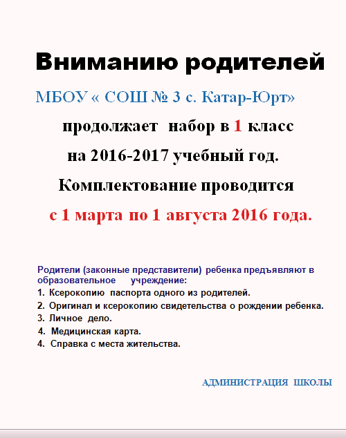 Вниманию родителей МБОУ « СОШ № 3 с. Катар-Юрт» продолжает набор в 1 класс на 2016-2017 учебный год. Комплектование проводится с 1 марта по 1 августа 2016 года.