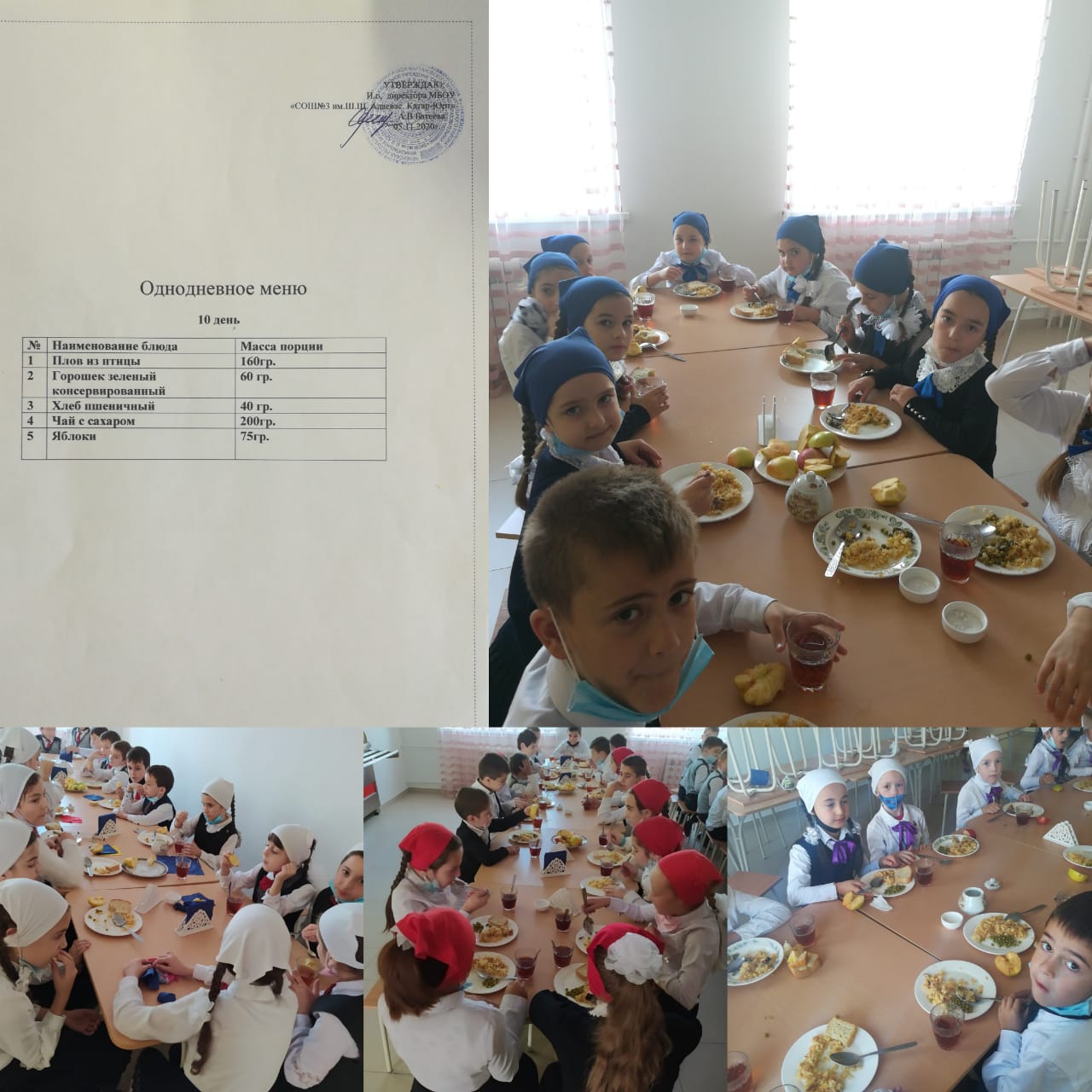 Сегодня в меню горячего питания: плов из птицы, горошек зелёный консервированный, хлеб пшеничный, чай с сахаром и яблоки