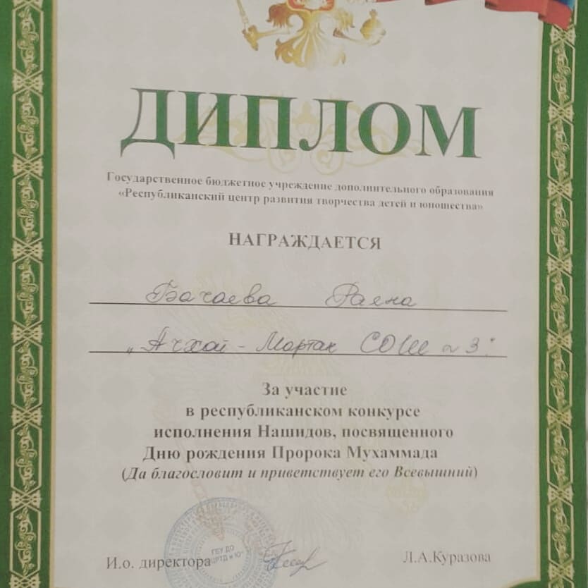 Поздравляем ученицу 10 класса Бачаеву Раяну Альвиевну, участницу республиканского конкурса исполнения Нашидов, посвященного Дню рождения Пророка Мухаммада (Да благословит и приветствует его Всевышний)