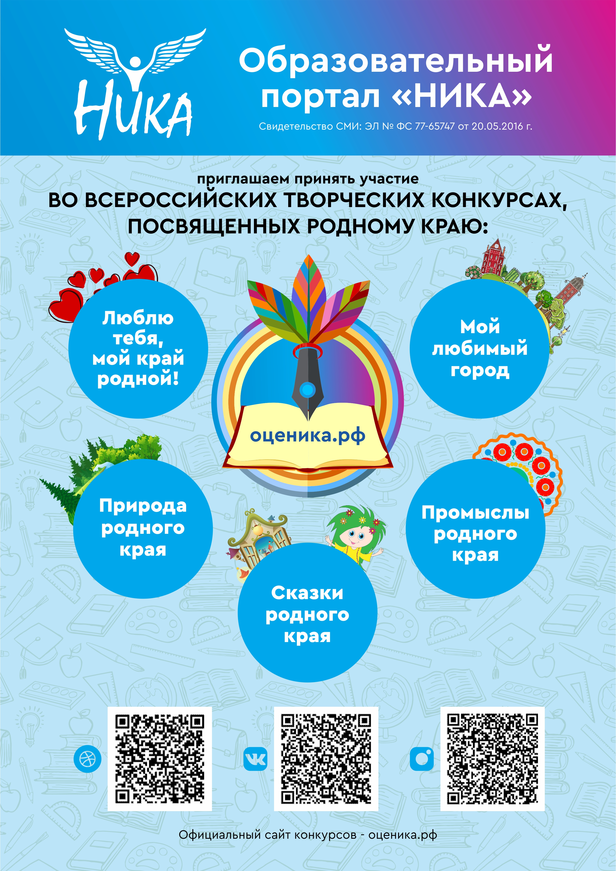 02.02.2021Образовательный портал «НИКА» (оценика.рф), являющийся всероссийским сетевым СМИ (свидетельство Роскомнадзора РФ ЭЛ № ФС 77-65747 от 20.05.2016 г.), предлагает участникам погрузиться в изучение культуры родного края, проявить активный интерес к народным промыслам региона и принять участие во всероссийских дистанционных конкурсах: «Люблю тебя, мой край родной!» - оценика.рф/konkursy/lyublyu-tebya-moy-kray-rodnoy «Пейзажи Родины моей!» - оценика.рф/konkursy/peyzazhi-rodiny «Природа родного края!» - оценика.рф/konkursy/priroda-rodnogo-kraya «Промыслы родного края!» - оценика.рф/konkursy/promysly-rodnogo-kraya «Сказки родного края» - оценика.рф/konkursy/skazki-rodnogo-kraya Для участия необходимо сделать электронную заявку на странице конкурса. Работы участников публикуются в СМИ «Образовательный портал «НИКА» - оценика.рф В конкурсах могут принять участие представители любых возрастных категорий и творческие коллективы. Порядок и условия участия представлены в Положениях. С более подробной информацией можно ознакомиться на сайте оценика.рф По вопросом обращайтесь к координаторам конкурса по адресу: admin@oc-nika.ru Для образовательных учреждений подготовлен информационный буклет оценика.рф/distancionnye-konkursy-o-rodnom-krae