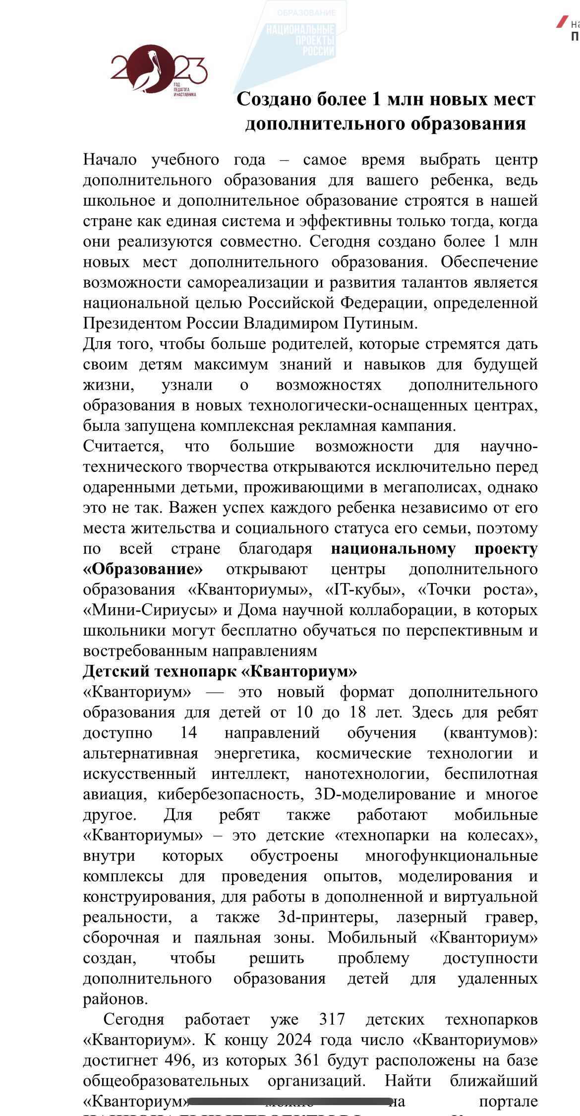 Сегодня работает уже 317 детских технопарков «Кванториум». К концу 2024 года число «Кванториумов» достигнет 496, из которых 361 будут расположены на базе общеобразовательных организаций. Найти ближайший «Кванториум» можно на портале НАЦИОНАЛЬНЫЕПРОЕКТЫ.РФ в разделе «Карты».