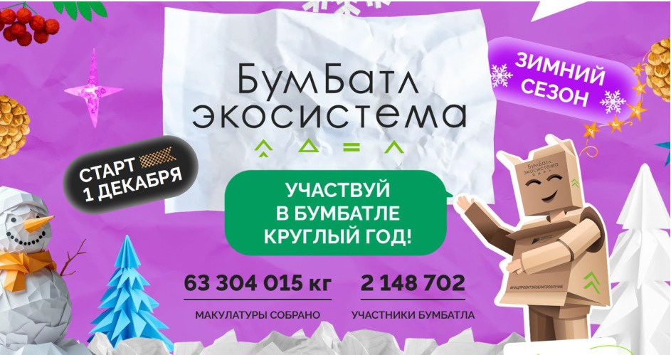 Акция «БумБатл» запускает новогодний конкурс ёлочных игрушек 1 декабря стартовал зимний сезон Всероссийской акции «БумБатл», которая проходит в поддержку нацпроекта «Экологическое благополучие» под эгидой всероссийского Движения «Экосистема». «Зима в «БумБатле» – это не просто сезон, а настоящий вызов для героев экологии! С 1 декабря собирайте макулатуру, создавайте эко-игрушки и ведите свою команду к вершинам – ведь каждый килограмм приближает нас к чистой планете, а ваши усилия вдохновят других участников акции», - сказал сопредседатель Движения «Экосистема» Андрей Руднев. Зимний сезон БумБатла пройдет с 1 декабря по 28 февраля 2026 года. Помимо сбора макулатуры участники смогут побороться за призы в творческом конкурсе «Новогодняя эко-игрушка от «БумБатла». Участники будут создавать ёлочные игрушки из старых газет, журналов, картона и другой ненужной бумаги, превращая отходы в украшения. Чтобы принять участие в конкурсе необходимо: собрать макулатуру и изготовить игрушку: бумажное животное (панду, сову или символ своего региона), эко-снежинку, шар в технике папье-маше или символ года. Украсить елку эко-игрушкой и сделать фото или видео. И опубликовать пост в соцсетях с хештегами #бумбатл #нацпроектэкоблагополучие #экосистема #эконовыйгод. Победителей ждут звания «Экодизайнер года», дипломы и призы зрительских симпатий. Оцениваются оригинальность идеи, качество исполнения, креативных подход и экологический посыл. Итоги творческого конкурса будут подведены в январе 2026 года. Принять участие в акции «БумБатл» могут все жители страны в личном и командном зачетах, а также бумагу можно сдать коллективами в детских садах, школах, колледжах, вузах, офисах, государственных учреждениях и предприятиях. Чтобы принять участие в акции необходимо зайти на сайт бумбатл.рф, зарегистрироваться, сдать макулатуру в любой удобный пункт приема и загрузить акт о сдаче в личный кабинет на сайте проекта. Результаты зимнего сезона и регионального зачетов по итогам года объявят весной 2026 г. Справка: Всероссийская акция по сбору макулатуры «БумБатл» проходит в поддержку национального проекта «Экологическое благополучие». Организаторы: АНО «Национальные приоритеты», Движение «Экосистема» при поддержке Минприроды России. «БумБатл» проводится в круглогодичном формате. Участники могут сдавать макулатуру в любое время, а итоги соревнования среди физических лиц и семей подводят каждый сезон. С марта 2025 года к акции присоединились более 1 млн человек, которые собрали более 37 тыс. тонн бумажного вторсырья. За пять лет в акции поучаствовали 9 миллионов человек, которые вместе направили на переработку 305 тысяч тонн макулатуры.