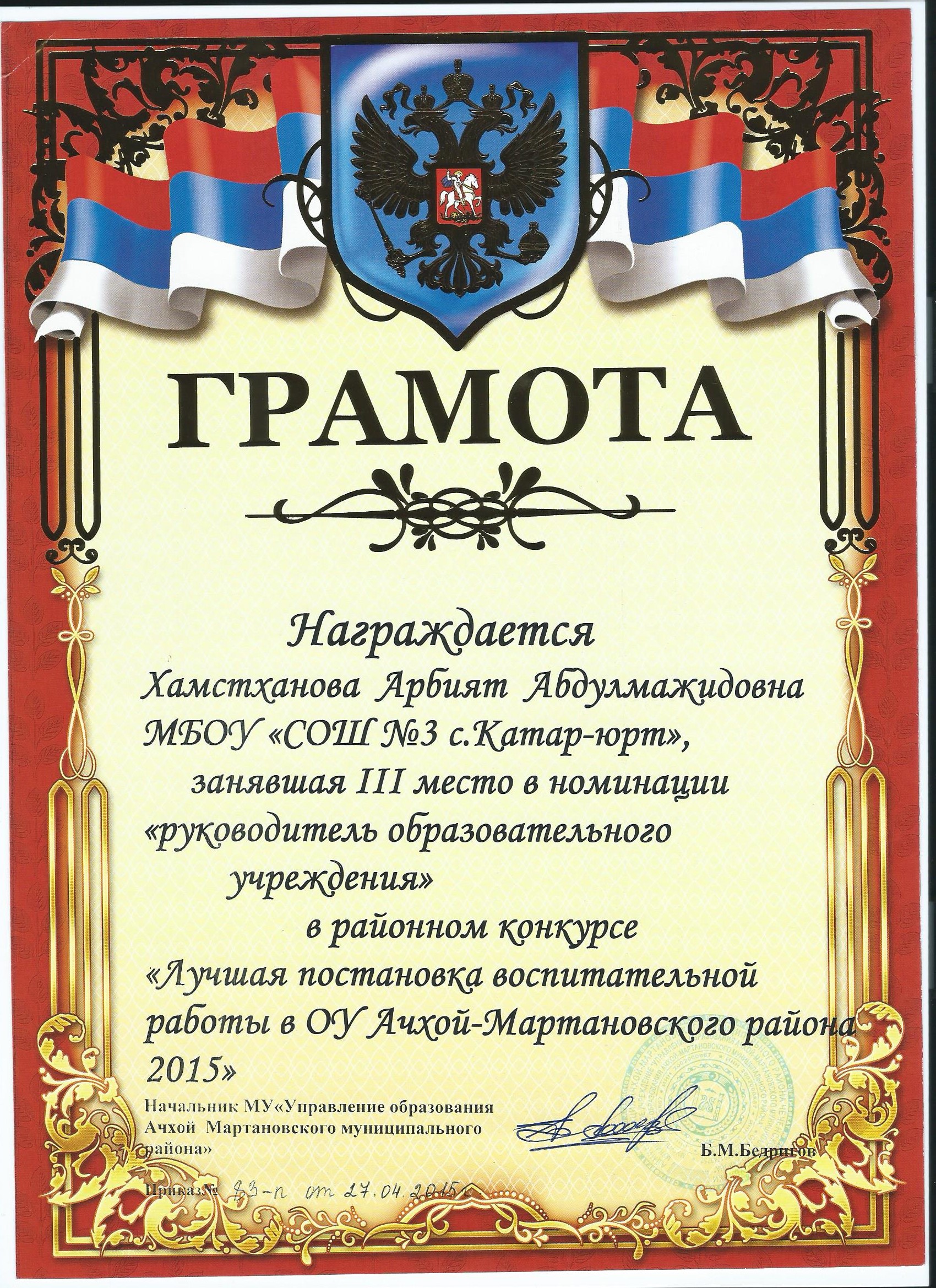 Директор школы Хамстханова Арбият Абдулмажидовна приняла участие в районном конкурсе в номенации "Руководитель образовательного учреждения"